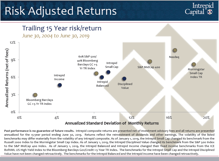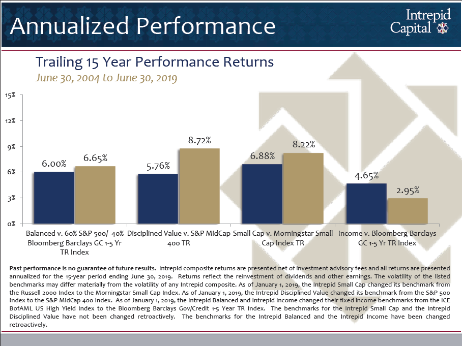 Year-to-date ending June 30, 2019, the Portfolio has performed reasonably well with an increase of 5.29%, net-of-fees, for the period, but it still lags the sexier equity-only indexes such as the S&P 500, which increased 18.54% for the same period. The blended benchmark, which is more representative of our intended balanced strategy, consisting of 60% S&P 500 and 40% Bloomberg Barclays Government/Credit 1-5 Year Index, increased 12.53% for the six-month period. Please keep in mind that the Portfolio typically holds about 65% in equity securities, which we believe has allowed us to participate on the upside in rising market environments and, historically, has generally made the downside market periods less severe.